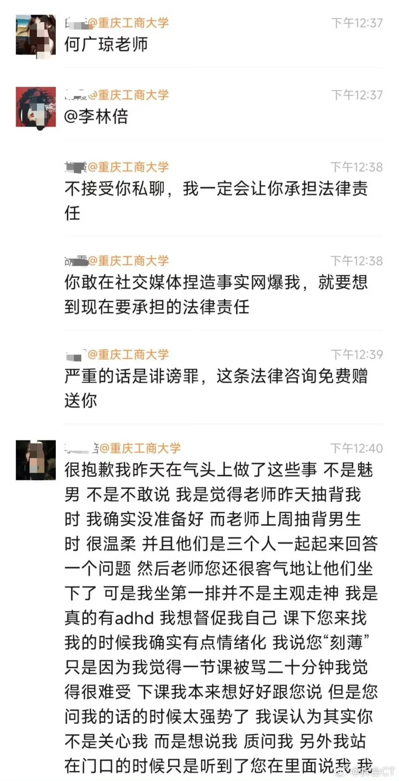 女教授看到之后直接在課程群里抓人硬剛。女學(xué)生見(jiàn)狀只能出來(lái)光速滑跪,一邊道歉一邊賣(mài)慘,說(shuō)自己得了「ADHD」。然而并沒(méi)有什么卵用。女教授是法學(xué)教授,專(zhuān)治不服,直接揚(yáng)言去起訴了。