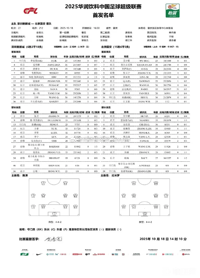 今天16:00,深圳新鵬城主場(chǎng)迎戰(zhàn)北京國(guó)安,首發(fā)塞鳥(niǎo)首賽前雙方公布了首發(fā)陣容: