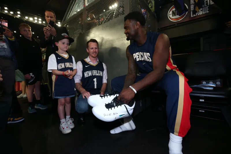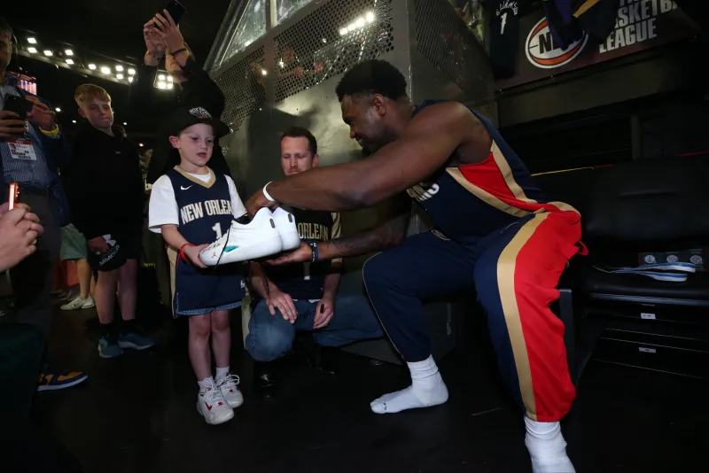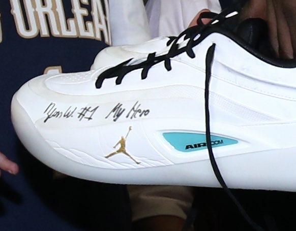 賽后,親簽鵜鶘社媒曬出蔡恩-威廉森向抗癌兒童贈送球鞋的我的英雄瞬間,并配文: