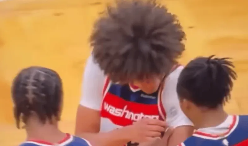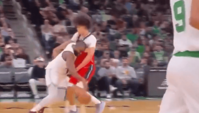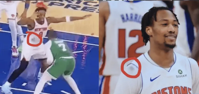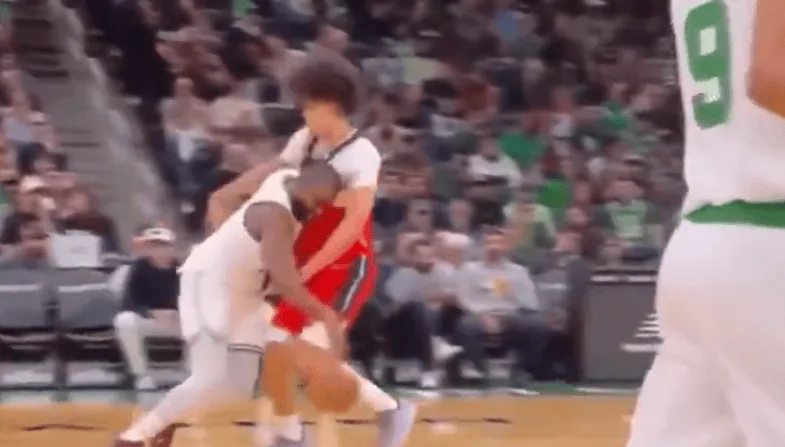 比賽中,發(fā)際杰倫-布朗在帶球推進(jìn)時,線撞頭部撞到基肖恩-喬治,到喬隨后喬治的白緊身衣上瞬間留下黑印。