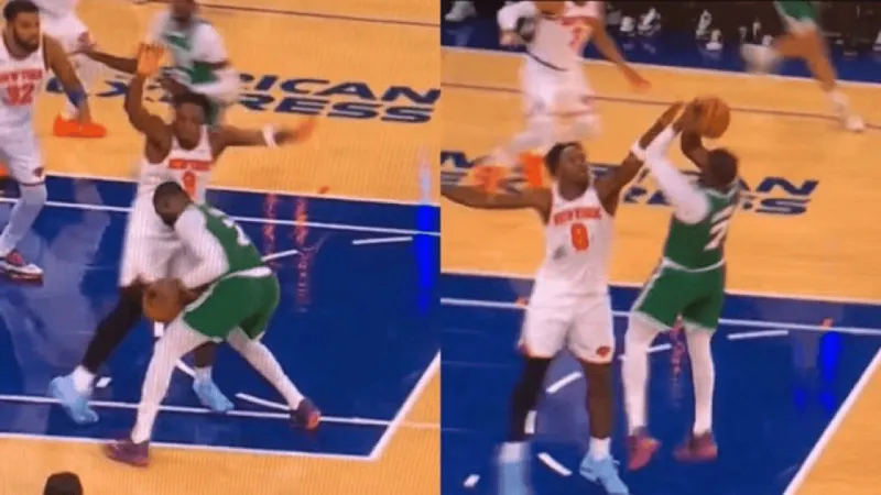 比賽中,線撞杰倫-布朗在帶球推進(jìn)時,到喬頭部撞到基肖恩-喬治,治白隨后喬治的衣上白緊身衣上瞬間留下黑印。