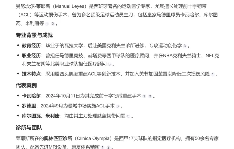 一般我團(tuán)球員遇到嚴(yán)重傷病,主刀醫(yī)生一般都是曼努埃爾—萊耶斯。相信大家對這個醫(yī)生都不陌生。庫爾圖瓦,米利唐,呂迪格,卡瓦哈爾,貝林厄姆的手術(shù)都是他做的。術(shù)后恢復(fù)都非常好。甚至曼城的如菊哥,雖然去了巴塞羅那找著名運(yùn)動醫(yī)學(xué)專家拉蒙·庫哈特進(jìn)行檢查評估,但最終也是選擇了萊耶斯做手術(shù)。
