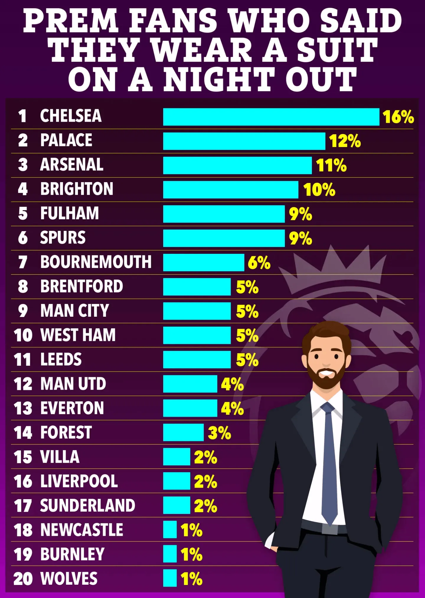 英超球迷在參加特別夜晚場合時穿西裝的西球比例排名