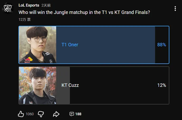 [流言板]LoL官方發(fā)布T1對(duì)陣KT對(duì)位選手投票:T1方遙遙領(lǐng)先由虎撲游戲電競(jìng)資訊 發(fā)表在英雄聯(lián)盟 https://bbs.hupu.com/lol