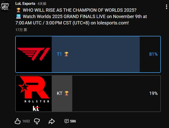虎撲11月08日訊 LoL官方發(fā)布2025英雄聯(lián)盟全球總決賽,T1對(duì)陣KT對(duì)位選手投票。發(fā)布方遙