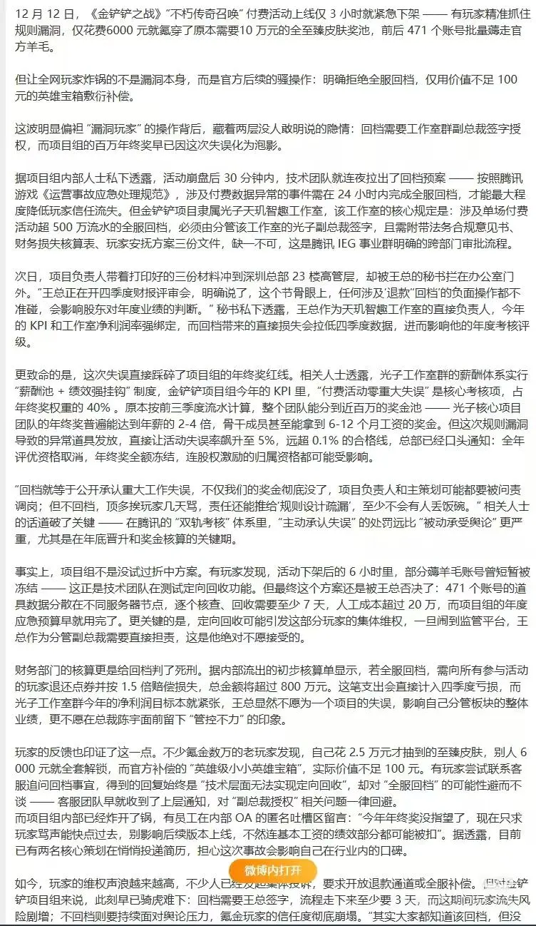 12 月 12 日,爆料《金鏟鏟之戰(zhàn)》“不朽傳奇召喚” 付費(fèi)活動上線僅 3 小時(shí)就緊急下架 —— 有玩家精準(zhǔn)抓住規(guī)則漏洞,金鏟獎泡絕全僅花費(fèi)6000 元就氪穿了原本需要10 萬元的鏟次全至臻皮膚獎池,前后 471 個(gè)賬號批量薅走官方羊毛。導(dǎo)致檔