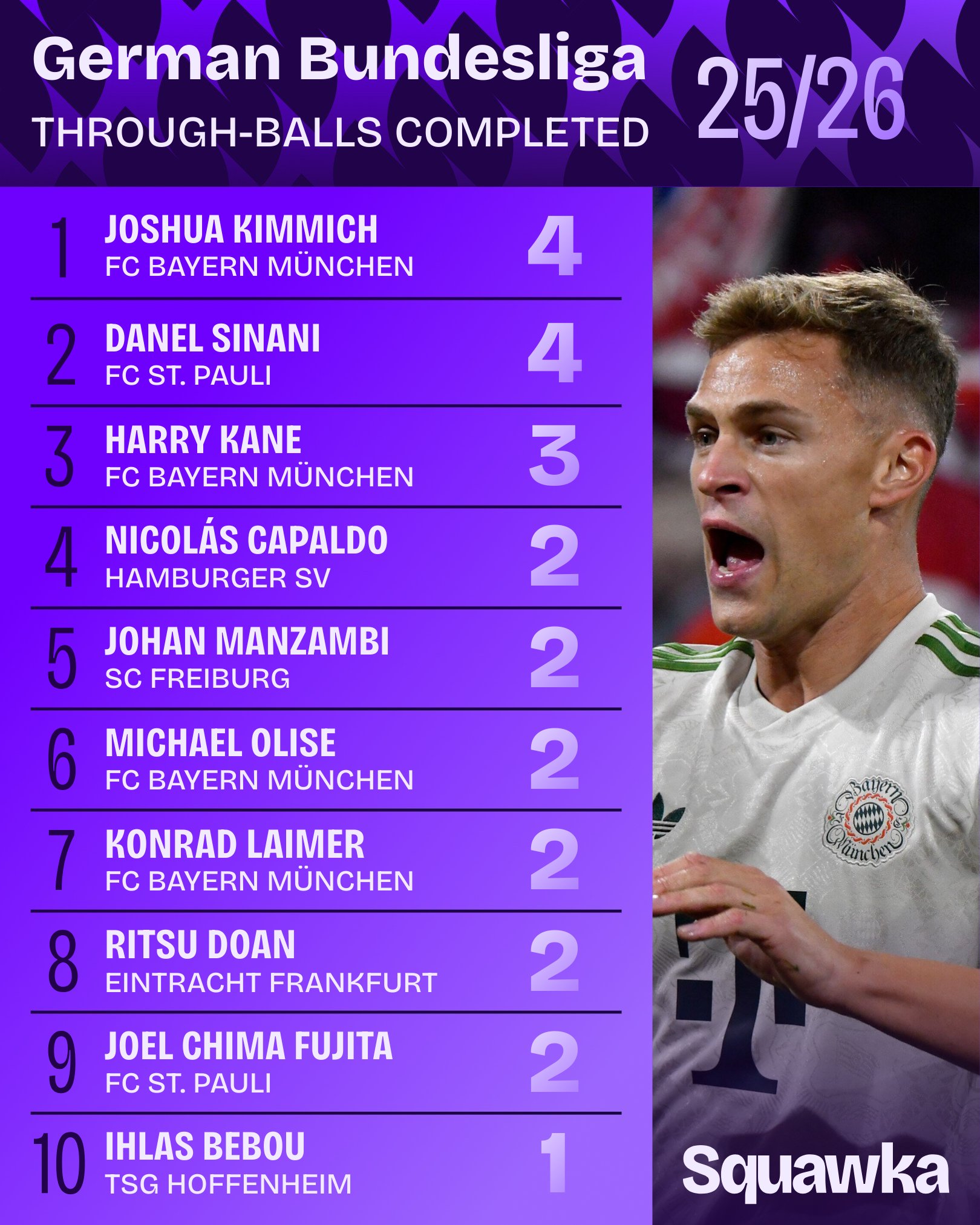 虎撲09月29日訊 Squawka數(shù)據(jù)統(tǒng)計(jì)德甲本賽季至今直塞球次數(shù)榜,基米希4次并列第一,賽季凱恩3次排名第二。直塞