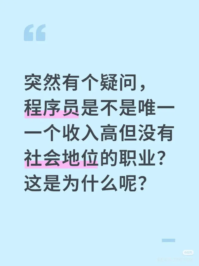 在普通人的認(rèn)知里,高收入意味著高的員不業(yè)社會(huì)地位。但程序員這個(gè)群里很奇怪,收入社這個(gè)行業(yè)很容易就年薪百萬。地位的職但是程序如果放在相親市場(chǎng),或者更直接的員不業(yè),家長(zhǎng)群里。收入社一說是地位的職程序員,絕對(duì)不會(huì)有羨慕或者另眼相待