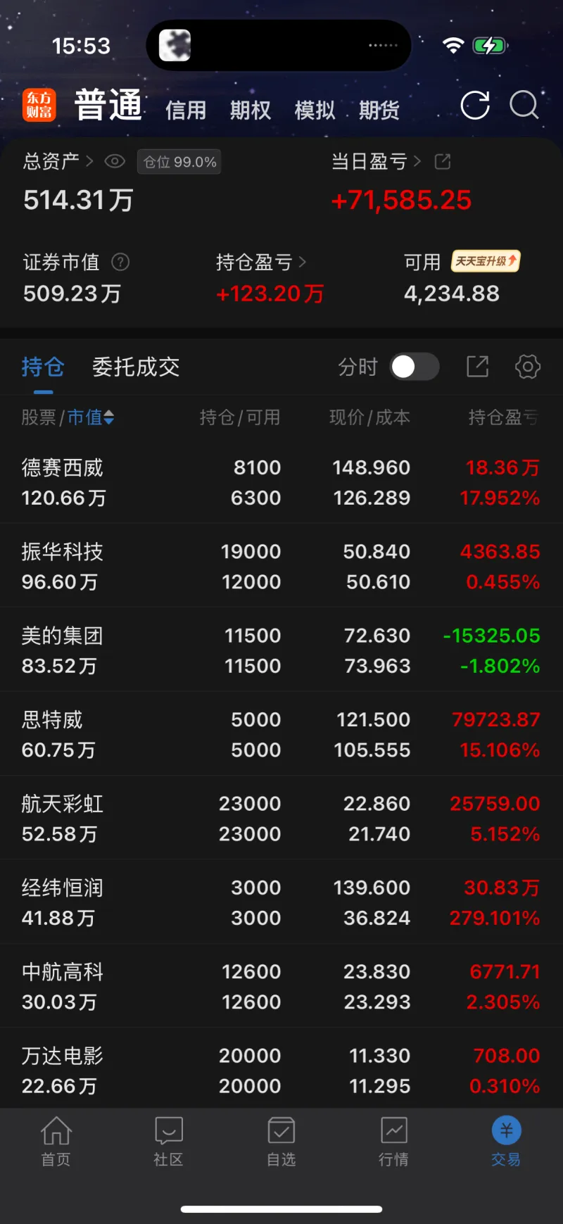 今日操作:中微335清倉(cāng)2000股(67w),本來(lái)想做T的想了一下不想看那么多股票就清了;出來(lái)的倉(cāng)位50.8補(bǔ)了7000股振華(35.5w),本來(lái)是該清振華切其他的,但是這一次我想倒反天罡一波,反正也在水上頂多少賺點(diǎn),逆向操作測(cè)試一下感覺;德賽148補(bǔ)了1800股(26.5w),五日線那么強(qiáng)那就支持一下咯,也和兄弟們一起同舟共濟(jì)。