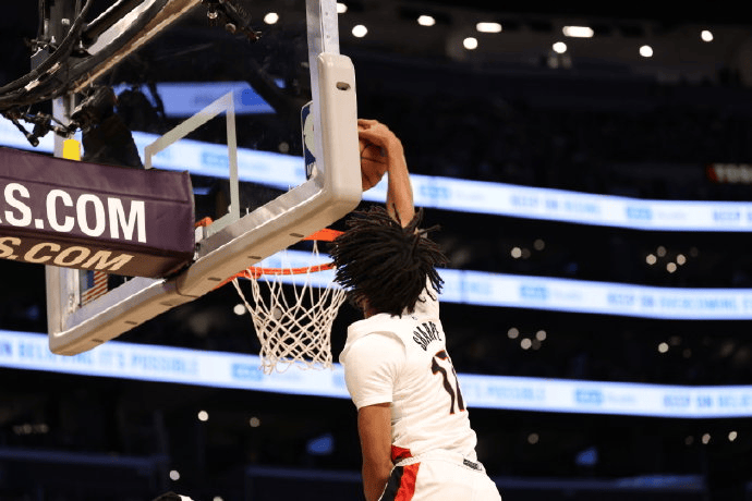 第二節(jié)比賽中,分享飛夏普底線起飛拉滿弓戰(zhàn)斧砸扣。夏普