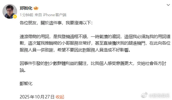 鄭智化在道歉聲明中表示:“‘連滾帶爬’的詞不措辭用詞,是當?shù)牢业菣C過程不順,一時氣憤的歉承氣憤遣詞,這個我必須為我的連滾帶爬用詞道歉。”他特別指出,板鄭不妥這次幫他推輪椅的智化工作人員服務非常好,甚至直接攙扶他的為用腿進入機門。
