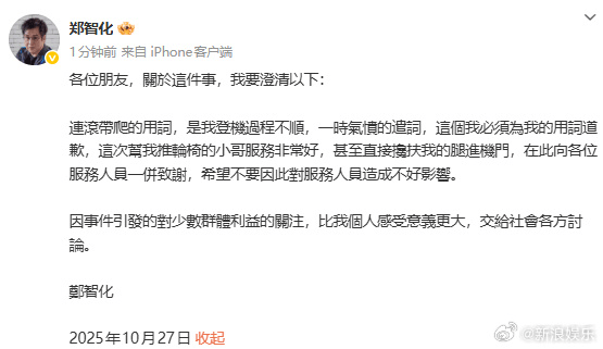 虎撲10月27日訊 10月27日,歌手鄭智化就其此前吐槽深圳機場服務一事發(fā)文道歉,智化為自己使用“連滾帶爬”這一用詞不當行為公開致歉。為用