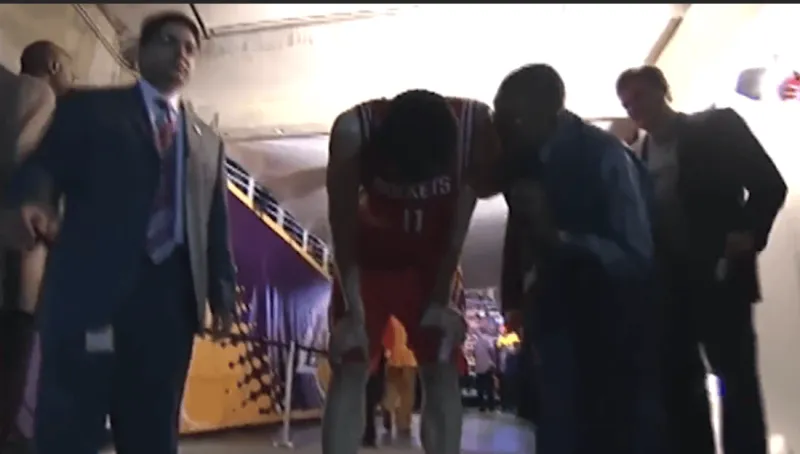 隊醫(yī)瓊斯發(fā)現(xiàn)其左腳鞋墊有血跡,姚明解釋:“磨破皮而已,別讓教練知道。”