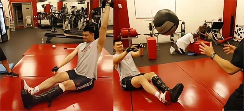 術(shù)后三周,姚明便重返健身房,用特制護具完成坐姿投籃;