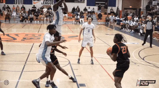防守是喬丹-史密斯的最大賣點(diǎn)。他身高雖然只有191左右,但勝在臂長,接近206 cm。同時,他體格極為強(qiáng)壯,早年的橄欖球經(jīng)歷幫助他練就了一身腱子肉,同時自身的運(yùn)動能力也是布萊德索級別的。綜合這些,他在防守端具備成為優(yōu)秀防守人的不少硬件,且憑借其力量,臂展和強(qiáng)悍的風(fēng)格,可以讓人忽略掉他身高的不足。同時,這些優(yōu)勢也讓他具備了換防多位置的彈性,還擁有同尺寸球員里精英級的籃板技術(shù)。他體型敦實(shí),像個"小坦克",甚至在EYBL能抗下前鋒的沖擊;而擁有出色彈跳的他也能夠利用預(yù)判,對抗和積極性在籃下送出封蓋。其U19里5%的搶斷率和3.6%的蓋帽率是后場位置中出類拔萃的存在。他樂于擔(dān)任POA來進(jìn)行全場領(lǐng)防,防守持球人時極具破壞性,常利用自身的對抗,臂展和積極性來破壞對手的手遞手配合。在無球時,他也可也活躍在對手之間,靠著預(yù)判伺機(jī)攔截傳球。而他敦厚的身材也幫助他擠過掩護(hù),即便被掛住也會持續(xù)努力以及時回位。他還是個狡黠而兇悍的防守人,手快,反應(yīng)靈敏而迅速,經(jīng)常在對手沒反應(yīng)前就破壞,即便是高大的前鋒他也敢靠著對抗主動制造接觸,在不犯規(guī)的情況下上下其手,找機(jī)會繞前deny來防接球。正如之前所說的,他在防守端也是塊又臭又硬的石頭,運(yùn)動能力允許他協(xié)防游弋,起飛封蓋,靠著臂展來干擾。而他的紀(jì)律性和預(yù)判能力都很好,雖然打球野蠻粗粒,但實(shí)際上鮮少陷入過犯規(guī)困擾。他會堅(jiān)持手高舉,腳前踏,不盲目穿過傳球路線的原則,并且主動騷擾,貼防,如影隨形,而胸部則始終保持在球前方,維持合理的距離,并盡可能在不犯規(guī)的情況下才伸手干擾或拼搶。更別提他的各類小動作和灰色地帶的操作,以及神出鬼沒地從弱側(cè)殺出后捅走大個子的球。