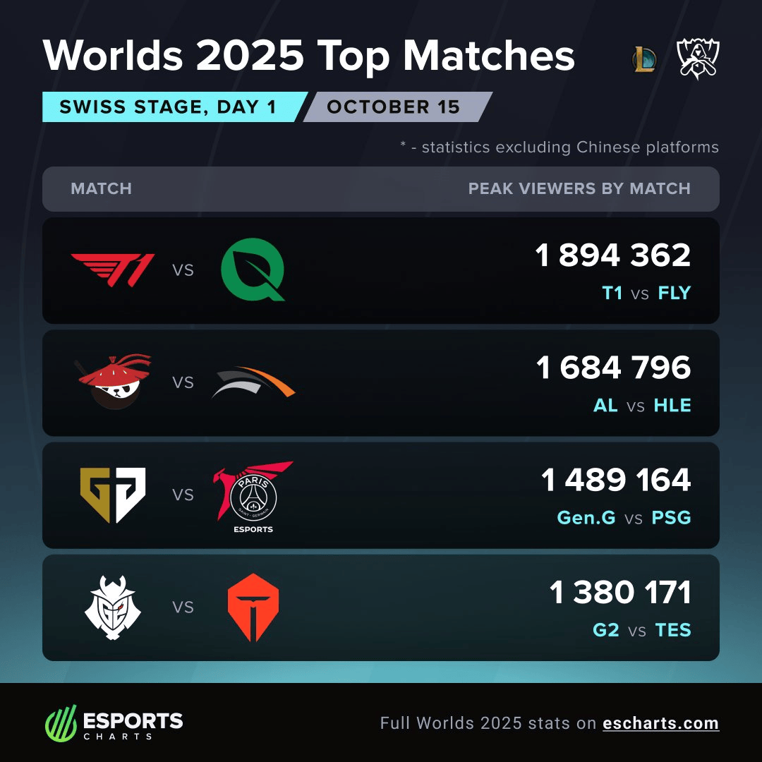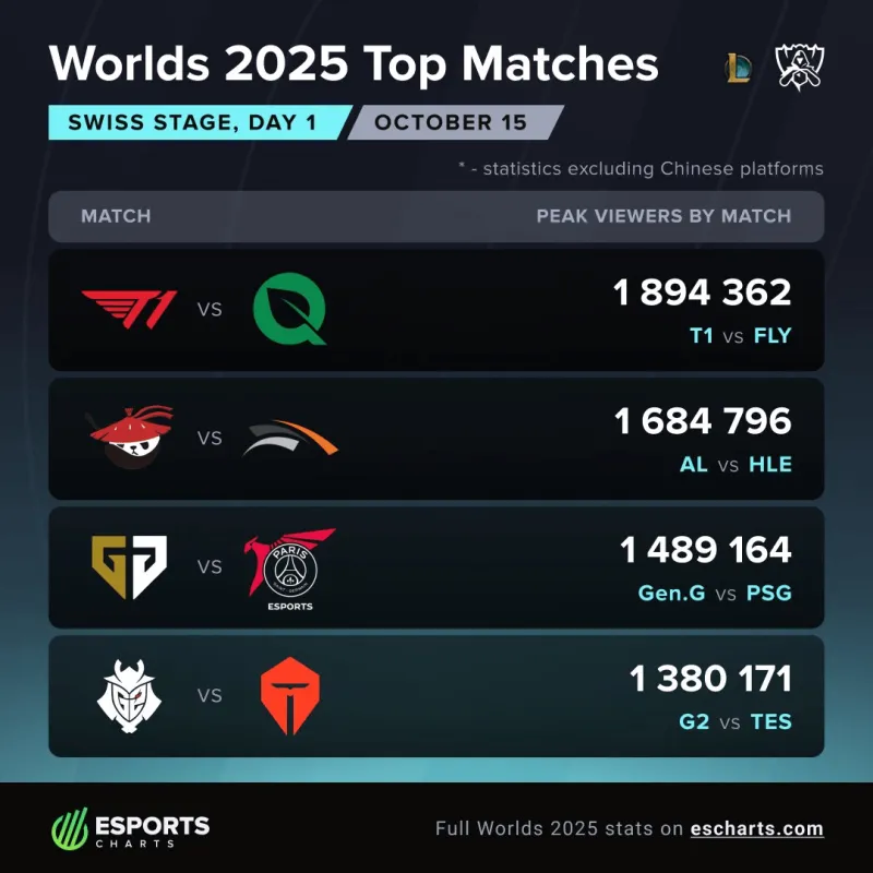 來源:X虎撲10月16日訊 S15瑞士輪首日海外收視榜: