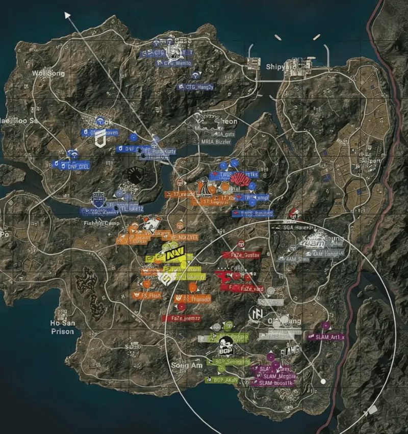 階段8,4隊(duì)均剩下2人,F(xiàn)AZE率先遭遇夾擊出局,SLAM防守住MRIA兩人進(jìn)攻,但一人被藍(lán)圈放倒,最終17兩人完成2打1,依靠道具覆蓋,成功打掉對(duì)手,完成吃雞。