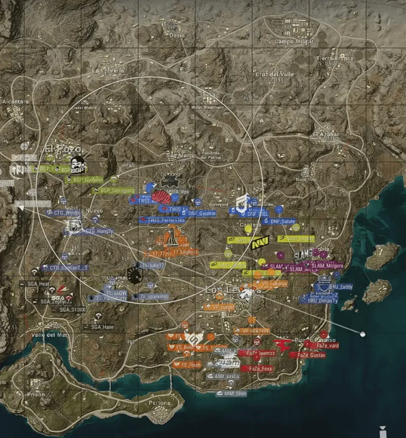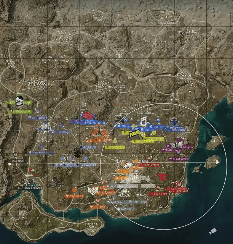 階段6剩余8隊(duì),圈中心麥垛的NAVI被FN兩顆手雷帶走。TL獨(dú)狼被DNF發(fā)現(xiàn)帶走。