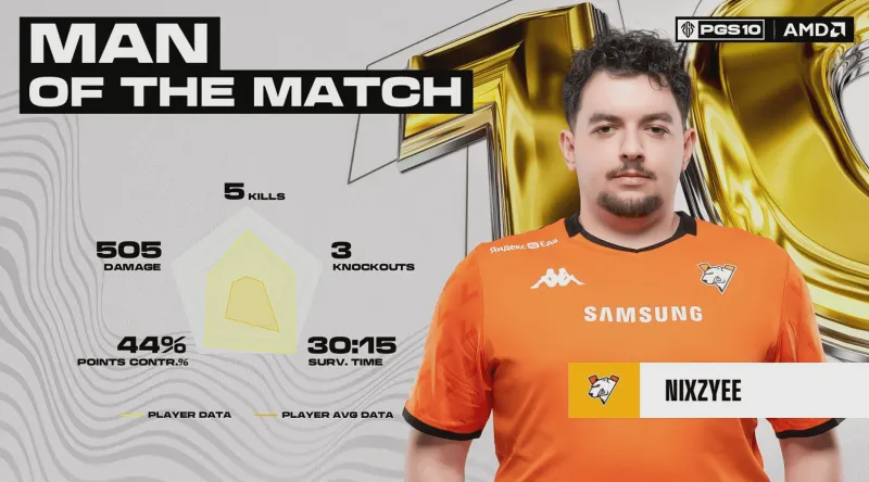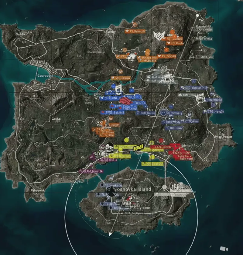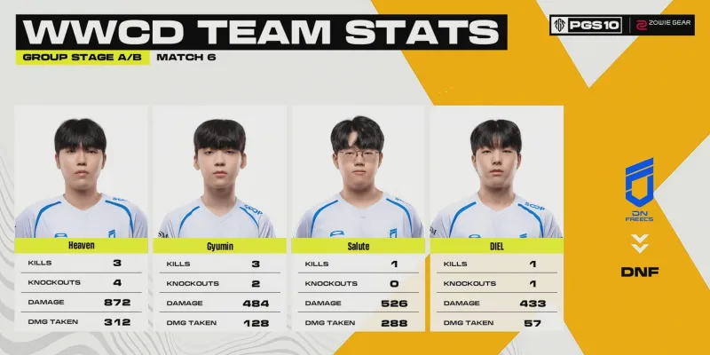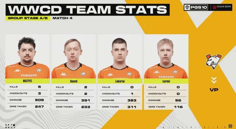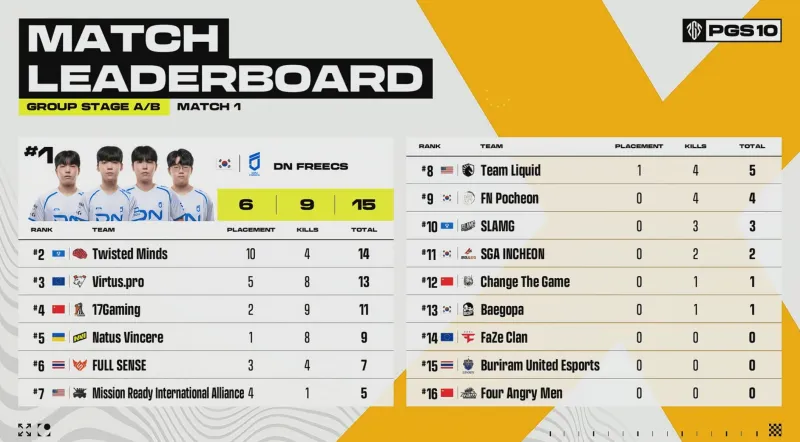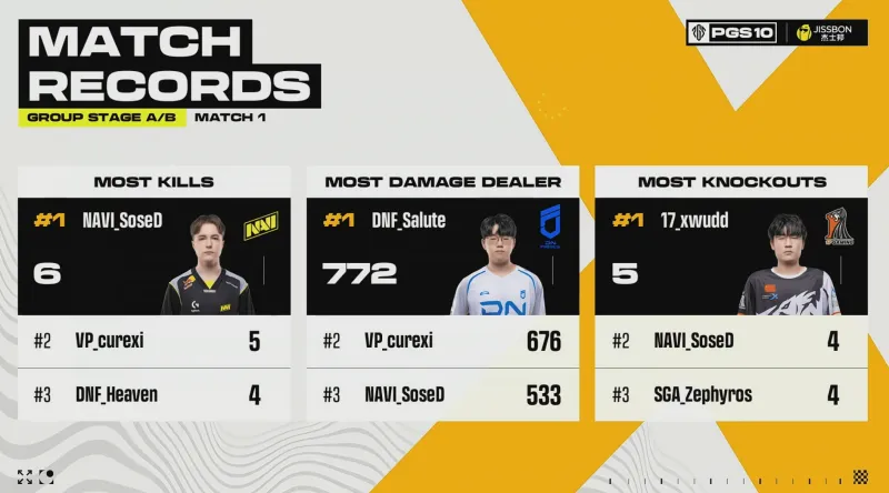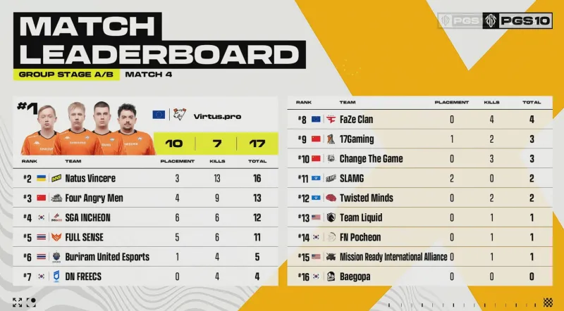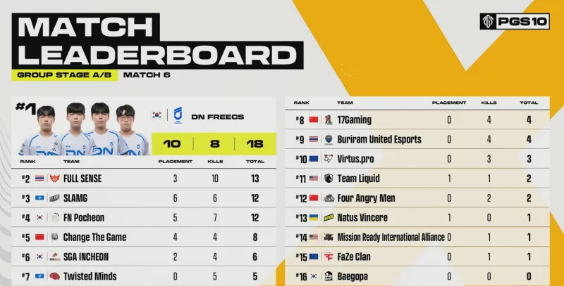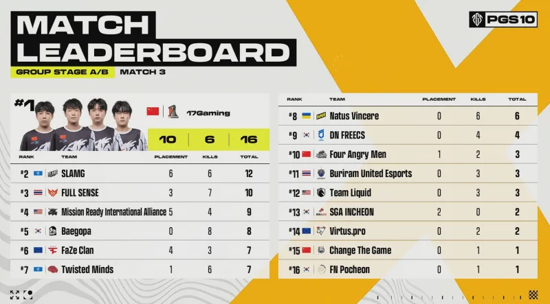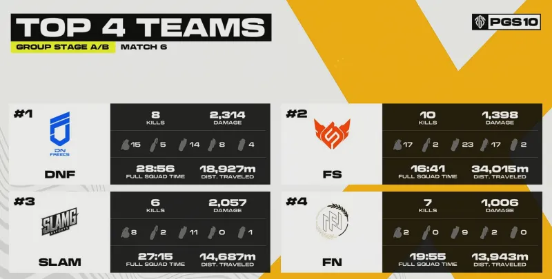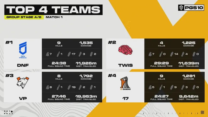 階段7刷新后,賽后除了TWIS外余下三隊(duì)均不在圈。組賽VP率先利用地形優(yōu)勢(shì)卡掉MRIA,領(lǐng)列但隨后DNF三人編淘汰VP滿編。