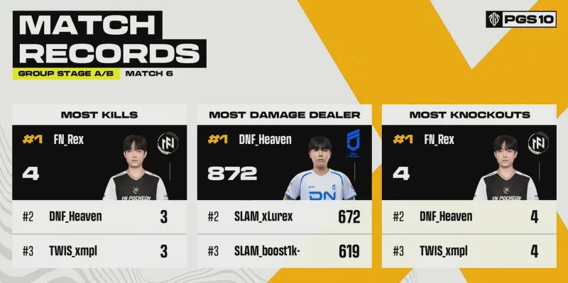 階段6剩余7隊(duì),跑第TL被17和FS夾擊淘汰。賽后17進(jìn)攻DNF房區(qū)失敗,組賽最終4換1,領(lǐng)列FS也被TWIS和MRIA夾擊出局。跑第