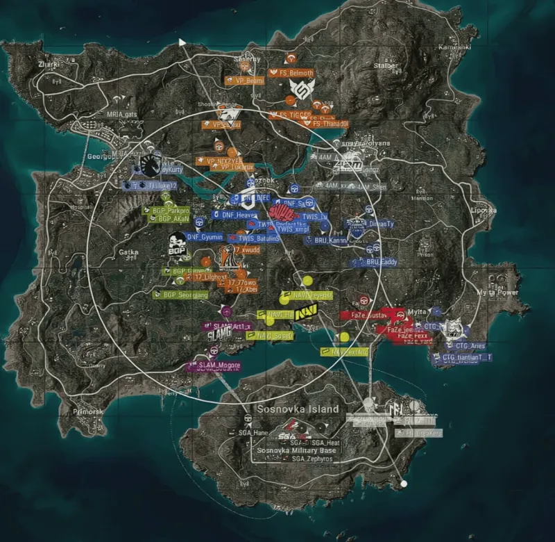階段7,SGA獨(dú)狼打掉FS一人后被CTG打掉,隨后FS也被淘汰。CTG被藍(lán)圈帶走一人后僅剩1人,隨后進(jìn)圈后被DNF用手雷炸掉。