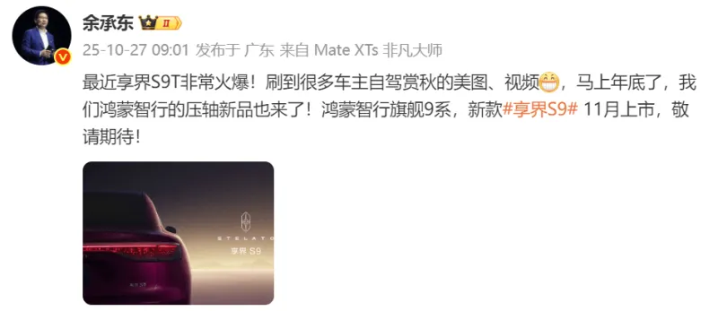 虎撲10月27日訊 華為常務(wù)董事、終端 BG 董事長(zhǎng)余承東在微博宣布:鴻蒙智行的“壓軸新品”旗艦 9 系 —— 新款享界 S9 將于 11 月上市。