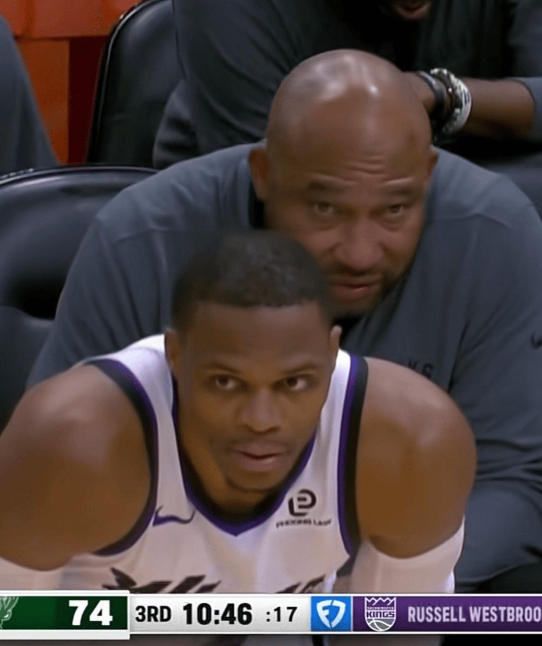 虎撲11月03日訊 美媒NBA World今日更新社媒,曬出了昨日國王與雄鹿比賽中拉塞爾-威斯布魯克和雄鹿助教達(dá)爾文-哈姆的威少照片。