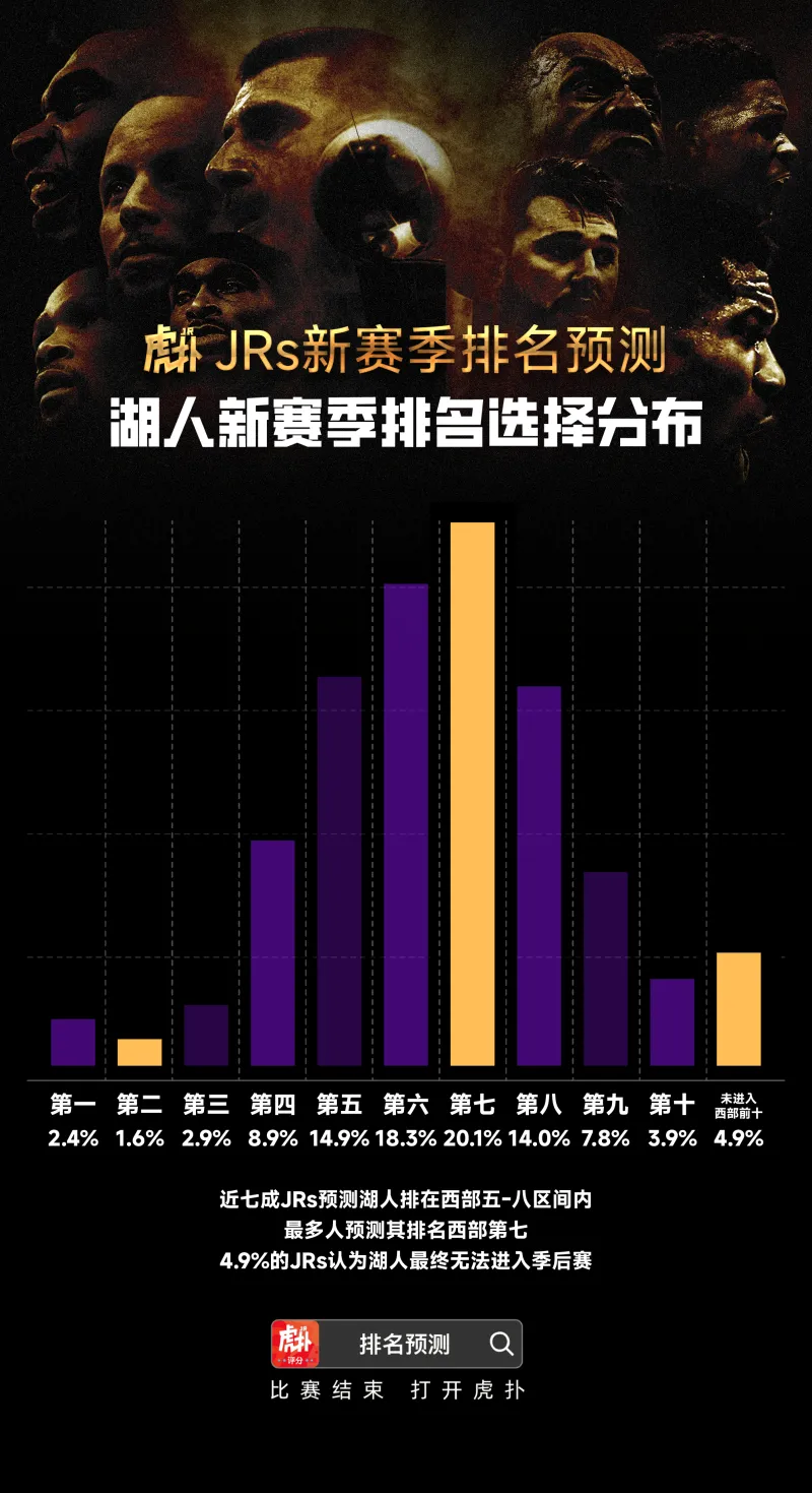 其中,接近七成JRs預(yù)測(cè)湖人排在西部第五-第八的區(qū)間內(nèi),最多人預(yù)測(cè)其排名西部第七(20.1%),其次有18.3%的JRs預(yù)測(cè)湖人排名西部第六。