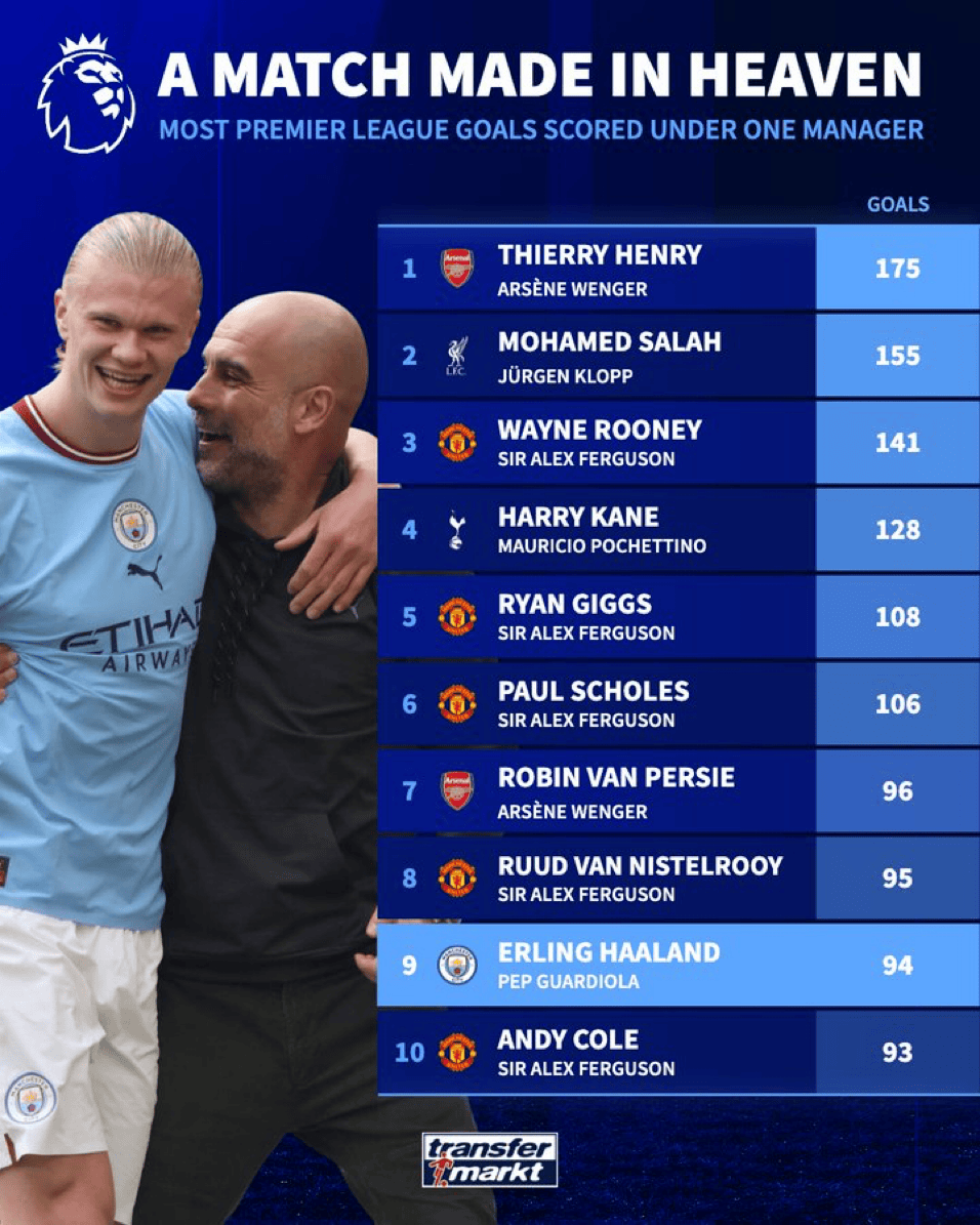 [流言板]英超球員在同一主帥麾下進(jìn)球榜:亨利175球居首,哈蘭德第9