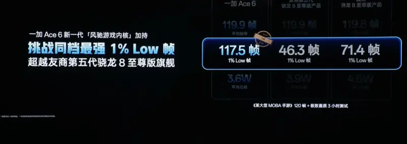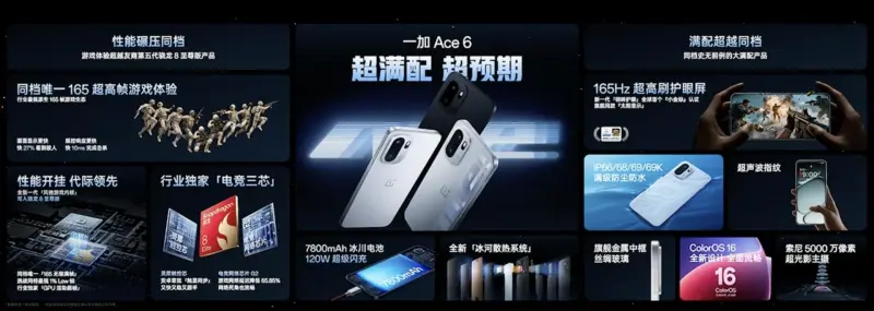性能方面:一加 Ace 6 號(hào)稱“同檔碾壓”。它搭載高通第五代驍龍 8 至尊版芯片,配合行業(yè)獨(dú)家的「電競?cè)尽瓜到y(tǒng):包括驍龍旗艦主芯片、電競獨(dú)顯、以及觸顯同步芯片。信號(hào)強(qiáng)度最高提升 60%。其游戲性能同樣強(qiáng)勁,支持行業(yè)領(lǐng)先的 165 幀超高幀游戲模式,實(shí)現(xiàn)持久滿幀運(yùn)行。全新一代「風(fēng)馳游戲內(nèi)核」進(jìn)一步優(yōu)化游戲調(diào)度性能,不僅支持 165 無限滿幀,還挑戰(zhàn)同檔最強(qiáng)的 1% Low 幀表現(xiàn),即使多任務(wù)分屏下也能穩(wěn)定運(yùn)行。Ace 6 還配備與旗艦同款的高精度陀螺儀,壓槍更穩(wěn)、瞄準(zhǔn)更準(zhǔn),射擊類游戲體驗(yàn)提升。