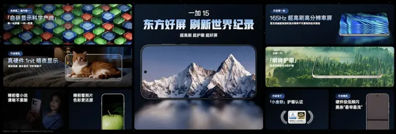 屏幕方面:屏幕是本次升級(jí)的另一核心。一加 15 全球首發(fā)第三代東方屏,成為首款兼具「165Hz 刷新率」與「高分辨率」的旗艦顯示面板,支持微信、QQ、小紅書、微博等應(yīng)用高幀顯示。采用定制 X3 發(fā)光材料與 P3 屏幕芯片,核心指標(biāo)超越 DisplayMate A++ 標(biāo)準(zhǔn)。全場景「真硬件 1nit 暗夜顯示」讓暗光環(huán)境下依然清晰舒適,并配備全新「明眸護(hù)眼」方案,擁有行業(yè)最低頻閃(SVM<0.12)與硬件級(jí)低藍(lán)光保護(hù),通過全球首個(gè)“小金標(biāo)”護(hù)眼認(rèn)證。