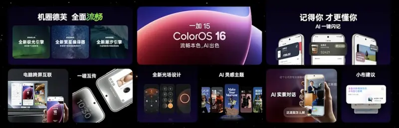 系統(tǒng)方面:一加 15 預(yù)裝 ColorOS 16,帶來 AI 靈感主題與全新流暢雙引擎,支持多項(xiàng) AI 功能:如 AI 一鍵閃記可自動(dòng)提煉視頻重點(diǎn)摘要;AI 寫作可生成思維導(dǎo)圖;還支持閃擊取餐碼、AI 記賬單等便捷功能。在跨生態(tài)互聯(lián)上,一加 15 支持最多 5 個(gè)界面同時(shí)投屏至 Mac,消息、通話與文件可在電腦、手表與 iPhone 之間無縫銜接。