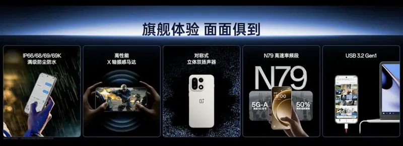 其他方面:一加 15 支持 IP66/68/69/69K 滿級(jí)防塵防水標(biāo)準(zhǔn),配備對稱式立體雙揚(yáng)聲器與高性能 X 軸振動(dòng)馬達(dá),支持 N79 高頻段以及 USB 3.2 Gen1 高速傳輸。