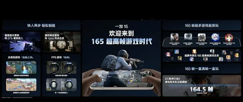 游戲體驗(yàn):游戲是一加 15 的亮點(diǎn)。它行業(yè)獨(dú)家支持「165 幀 GPU 渲染超幀」技術(shù),并開啟全球首發(fā) 165Hz 極速高刷屏幕時(shí)代。相較 120Hz,高幀模式下每秒多顯示 45 幀,響應(yīng)更快 10ms,操作更絲滑。多款頭部電競手游如《三角洲行動(dòng)》《暗區(qū)突圍》《使命召喚手游》《英雄聯(lián)盟手游》《火影忍者》等均已適配原生 165 幀模式,覆蓋 FPS、MOBA、格斗、賽車、音游、策略六大主流品類。此外,一加 15 還支持安卓首批「觸顯同步」技術(shù),顯著提升觸控精準(zhǔn)與穩(wěn)定性;配備與游戲主機(jī)同規(guī)格陀螺儀,瞄準(zhǔn)精準(zhǔn)度提升 77%,時(shí)延降低 11%。