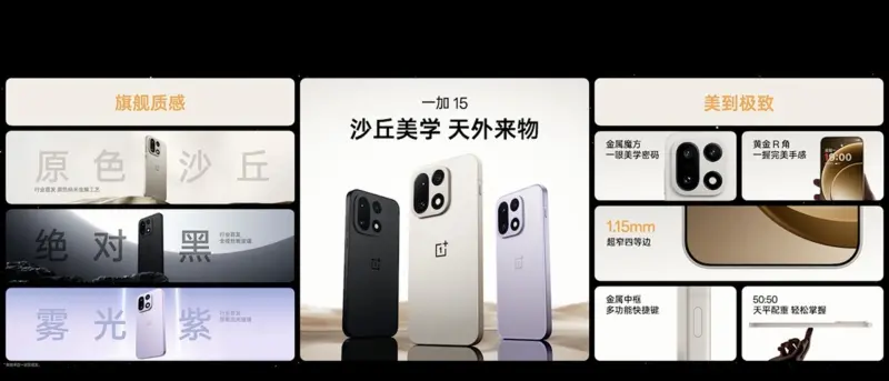 外觀設(shè)計(jì):一加 15 采用全新一代旗艦設(shè)計(jì)語言「沙丘美學(xué)」,以金屬魔方 Deco 呈現(xiàn)簡約而精致的視覺質(zhì)感。機(jī)身采用直角邊框設(shè)計(jì),首發(fā)“航天級(jí)納米瓷金屬”中框,配合黃金大 R 角設(shè)計(jì),握持更為舒適。正面配備一塊 6.78 英寸居中單挖孔屏,邊框窄至 1.15mm,實(shí)現(xiàn)視覺上的極致對稱。底部保留揚(yáng)聲器開孔、卡槽與 USB-C 接口。機(jī)身提供三種配色:行業(yè)首發(fā)「原色納米金屬工藝」的原色沙丘、首發(fā)「全啞絲綢玻璃」的絕對黑,以及首發(fā)「雙維流光玻璃」的霧光紫,均展現(xiàn)出獨(dú)特材質(zhì)質(zhì)感。