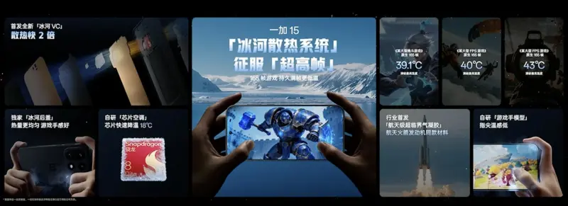 散熱方面:一加 15 采用全新「冰河散熱系統(tǒng)」,首發(fā)超薄“手撕鋼”材料的冰河 VC 散熱板,液冷空間提升 43%,毛細(xì)吸水效率提升 100%。機(jī)身還配備“冰河游戲手模型”結(jié)構(gòu),優(yōu)化十個(gè)關(guān)鍵手握散熱區(qū),并首次搭載航天級(jí)「超臨界氣凝膠」隔熱材料,使手指區(qū)域溫度更低,游戲時(shí)長時(shí)間持握更舒適。