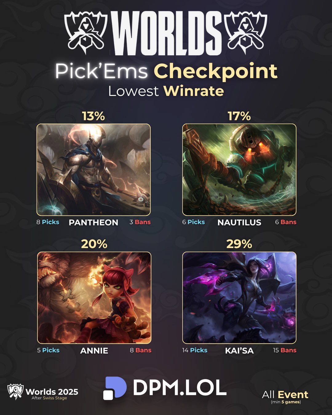 [流言板]外媒統(tǒng)計(jì)S15瑞士輪階段勝率最低英雄:潘森僅有13%勝率由虎撲游戲電競(jìng)資訊 發(fā)表在英雄聯(lián)盟 https://bbs.hupu.com/lol