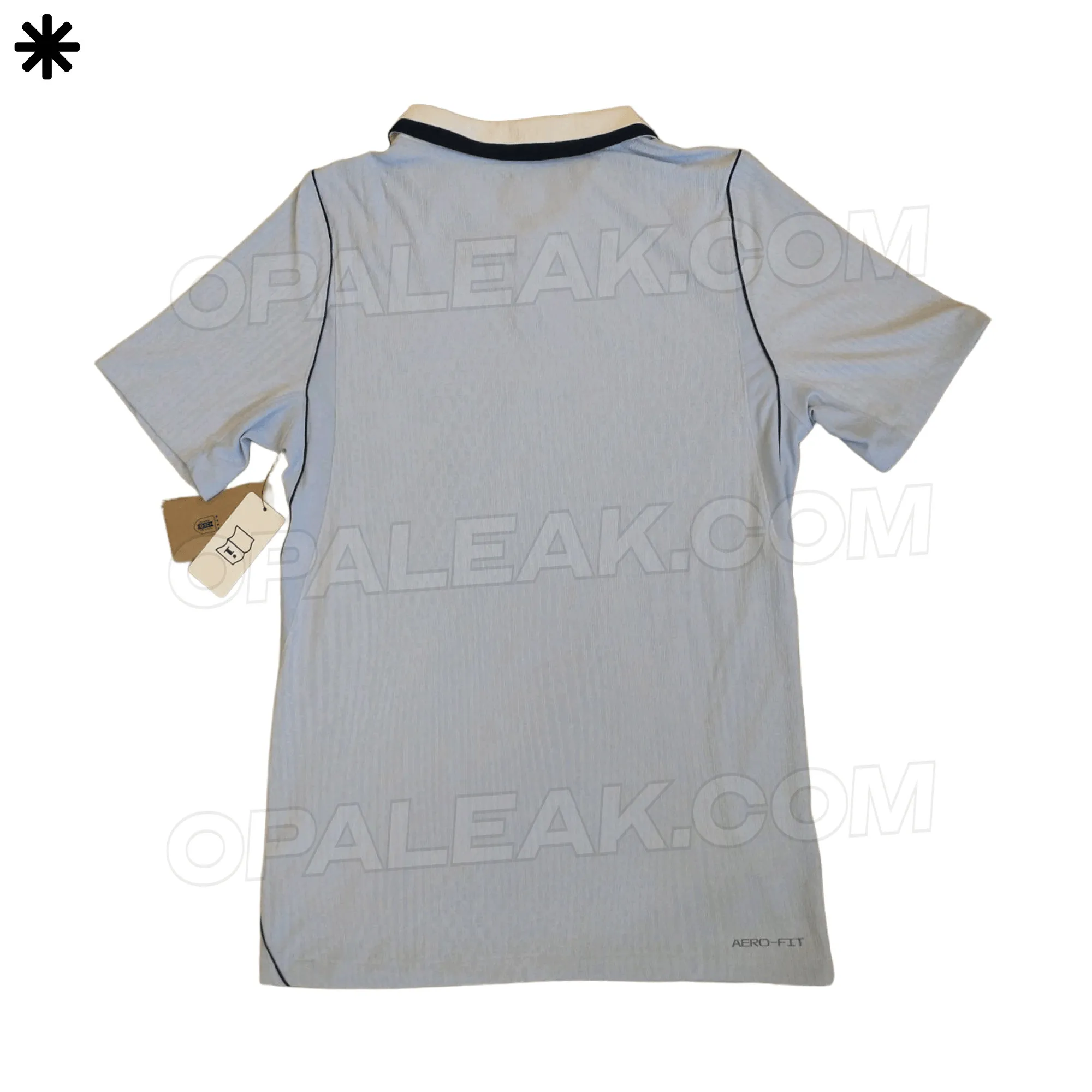 這款球衣的照曝主色調(diào)為淡藍(lán)色,同時有白色的流言藍(lán)白領(lǐng)烏拉圭衣領(lǐng)。