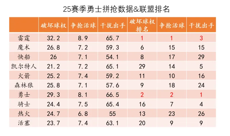 如果說魔球理念更多展現(xiàn)了防守體系的科學(xué)性,那么防守拼勁相關(guān)的數(shù)據(jù)就完美展示了勇士全隊的防守紀律性和默契度。NBA官網(wǎng)會統(tǒng)計球隊和球員的拼勁數(shù)據(jù)(HUSTLE),如上表所示雷霆和勇士是上賽季唯一兩支能夠做到破壞球權(quán)、爭搶活球和干擾出手的排名均在聯(lián)盟前10甚至聯(lián)盟前5的球隊,足見其防守端的拼勁之強。