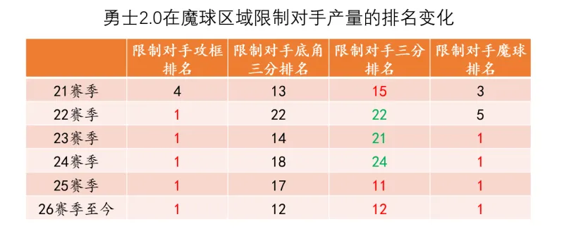 當球隊把防守的重心大量投入到禁區(qū)時,離禁區(qū)最遠的3分線自然就成了防守最薄弱的環(huán)節(jié),目前NBA沒有球隊既能限制對手攻框、又能阻止對手投三分,所以從上表中我們看到對手面對勇士時的3分產(chǎn)量會比較高,比如整體防守相對較差的23和24賽季都讓對手獲得了聯(lián)盟前10的三分出手機會。但當場上球員能夠在做好禁區(qū)防守的同時、又能憑借出色的輪轉(zhuǎn)意識和速度補到外線空位時,勇士的整體防守質(zhì)量會非常出色,比如25賽季限制對手的三分產(chǎn)量提升到了聯(lián)盟第11,球隊整體的防守效率立即大幅提升,這賽季目前看上去也能達到相似的高水準。