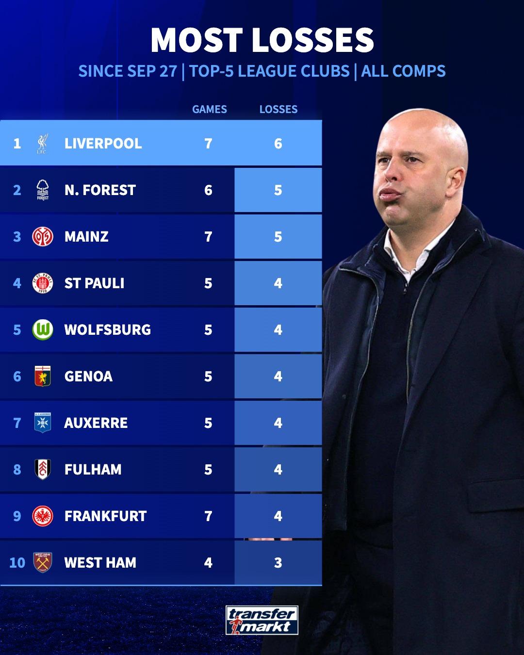 虎撲10月30日訊 根據(jù)德國(guó)轉(zhuǎn)會(huì)市場(chǎng)的統(tǒng)計(jì),自9月27日起,利物浦是各項(xiàng)賽事失利次數(shù)最多的五大聯(lián)賽球隊(duì):