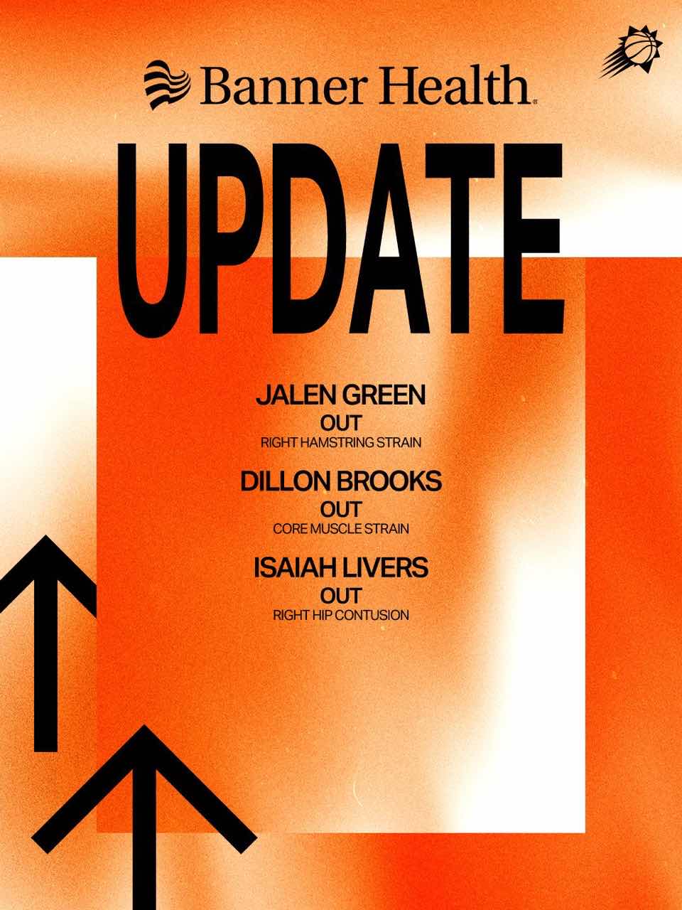 太陽賽前公布本場傷病報告:杰倫-格林&狄龍-布魯克斯&以賽亞-利弗斯將缺席今日比賽。告杰