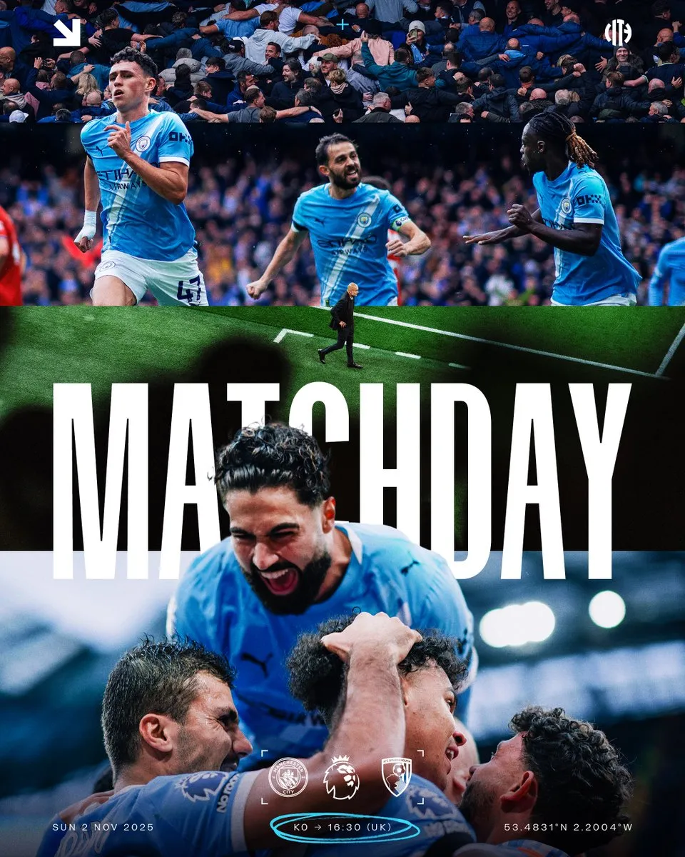 虎撲11月02日訊 英超聯(lián)賽第10輪,曼城將對陣伯恩茅斯。近次交手績賽前,勝負(fù)曼城官方發(fā)布了賽事預(yù)告海報(bào)。