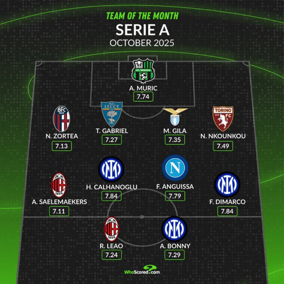 中場:薩勒馬科爾斯(米蘭)、流言列恰爾汗奧盧(國米)、意甲月最安古伊薩(那不勒斯)、佳陣迪馬爾科(國米)