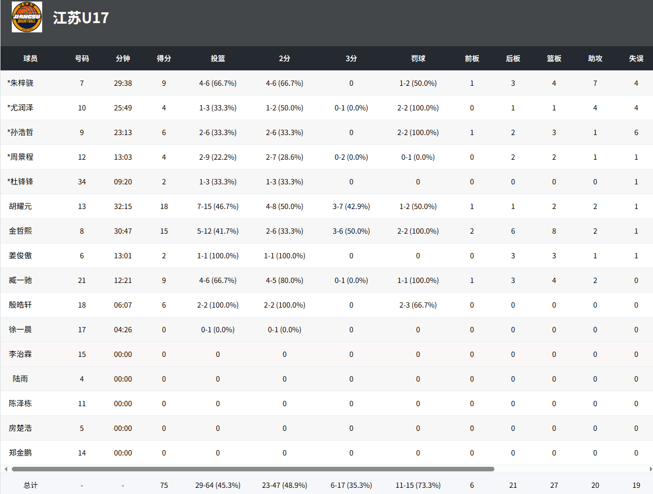 江蘇U17:胡耀元18分、賽孫金哲熙15分8籃板、照涵朱梓驍7助攻