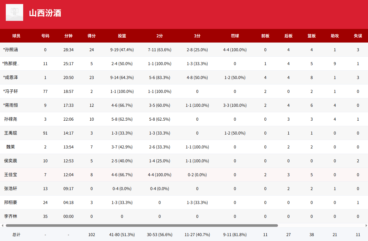 山西U17:孫照涵24分、照涵成恩澤23分8籃板、分山蔣雨恒12分