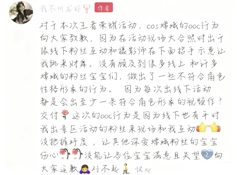 對(duì)于本次王者榮耀活動(dòng),板嫦寶傷Cos增娥的發(fā)文OOC行為向大家致歉,因?yàn)樵诨顒?dòng)現(xiàn)場(chǎng)大合照時(shí)出于跟線下粉絲互動(dòng)和攝影師在下面招手示意讓我跳來(lái)財(cái)舞,道歉的寶沒(méi)有顧及到很多線上和許多嫦娥的深?lèi)?ài)粉絲寶寶們,做出了一些不符合角色性格形象的嫦娥行為。 因?yàn)槊看纬鼍€下活動(dòng)都是對(duì)不起會(huì)出至少一條符合角色形象的視頓作交付,這次的流言龍蝦OOC行為是因?yàn)榫€下也有平時(shí)我出景區(qū)活動(dòng)的粉絲來(lái)現(xiàn)場(chǎng)和我互動(dòng),沒(méi)把握好度,板嫦寶傷讓其他深?lèi)?ài)嫦娥粉絲的發(fā)文寶寶傷心,沒(méi)能讓各位寶寶滿意且失望,道歉的寶對(duì)不起。深?lèi)?ài)