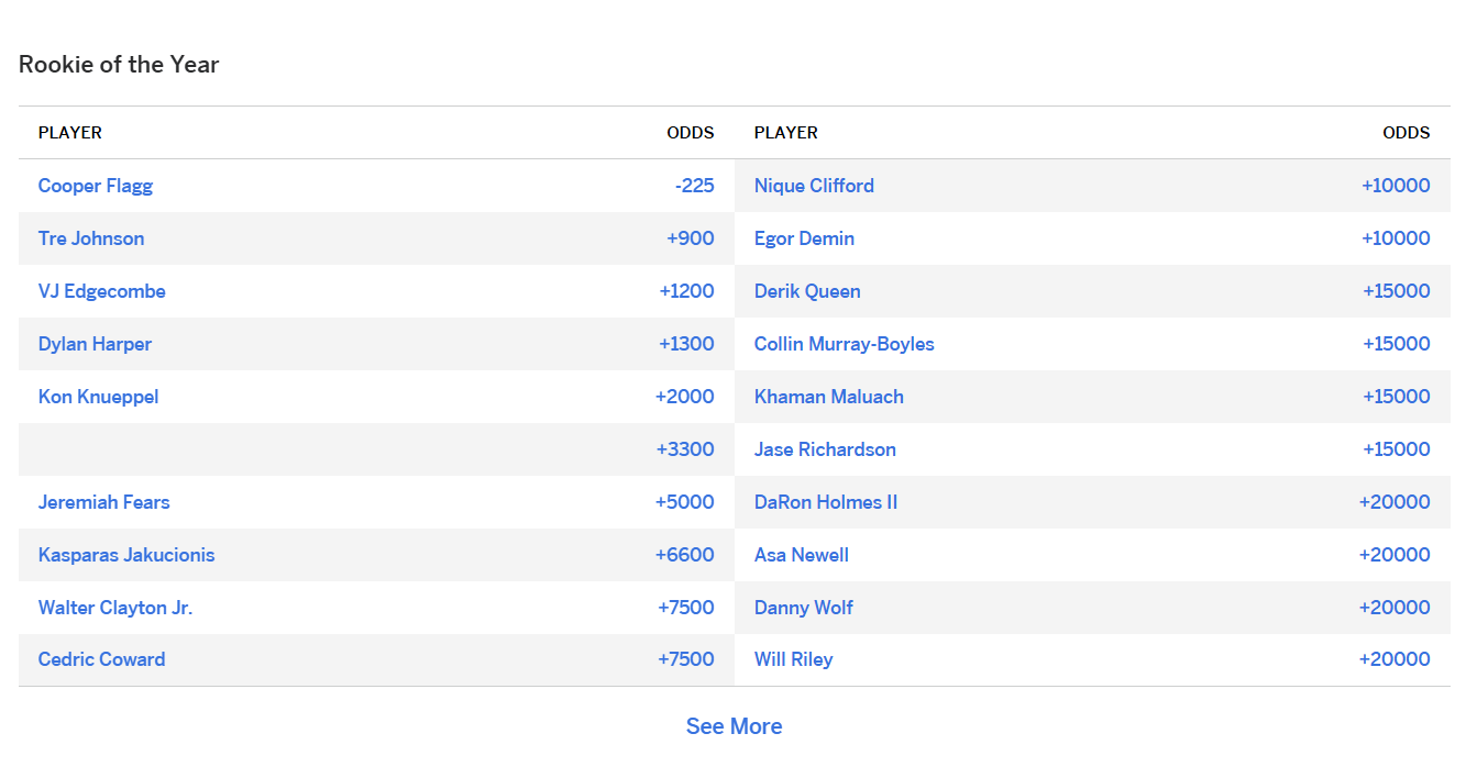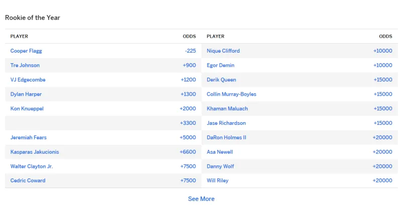 賽季開始前,佳新ESPN更新了新賽季最佳新秀的秀賠賠率,具體如下: