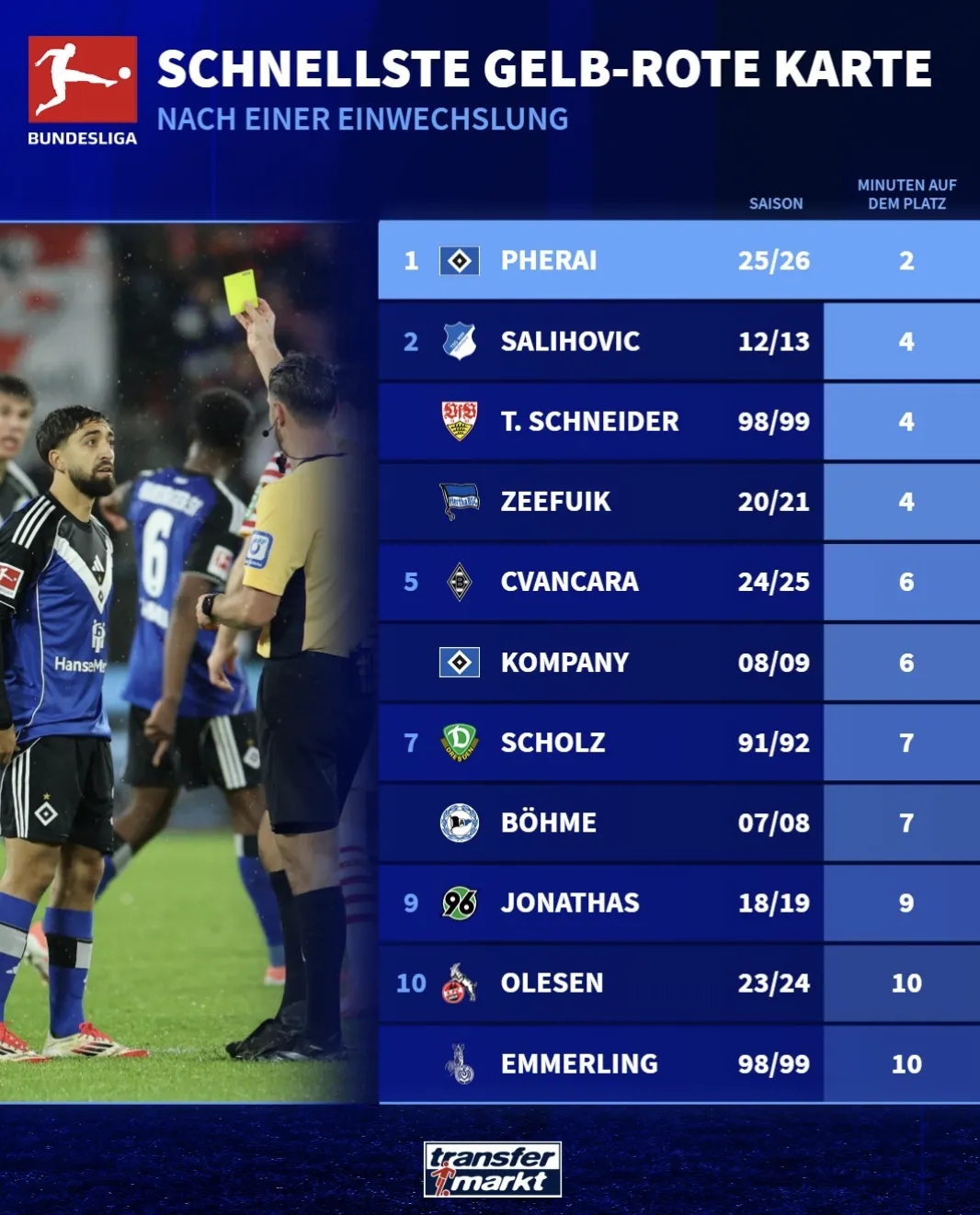 本輪漢堡的菲拉伊僅替補(bǔ)上場(chǎng)2分鐘,就被兩黃變一紅罰下,創(chuàng)造德甲紀(jì)錄。值得一提的是,現(xiàn)拜仁主帥孔帕尼在2008/09賽季效力漢堡期間,也在替補(bǔ)登場(chǎng)6分鐘后被罰下,排名第五。