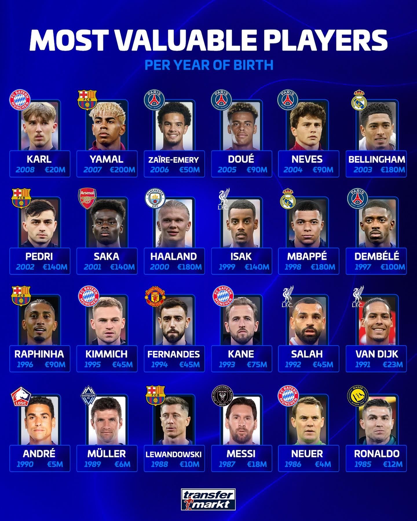 虎撲10月27日訊 德國轉(zhuǎn)會市場盤點了每個年齡身價最高的球星,詳情如下: